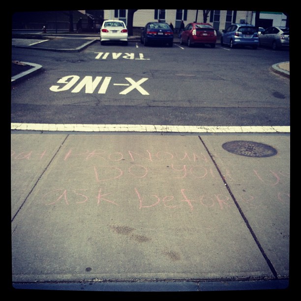 Spotted this chalk message in Northampton: “What pronouns do you use? Ask before assuming!” 0 March 15, 2012 Written by Mel Choyce Share this: Click to share on X (Opens in new window) X Click to share on Facebook (Opens in new window) Facebook Like Loading... Related